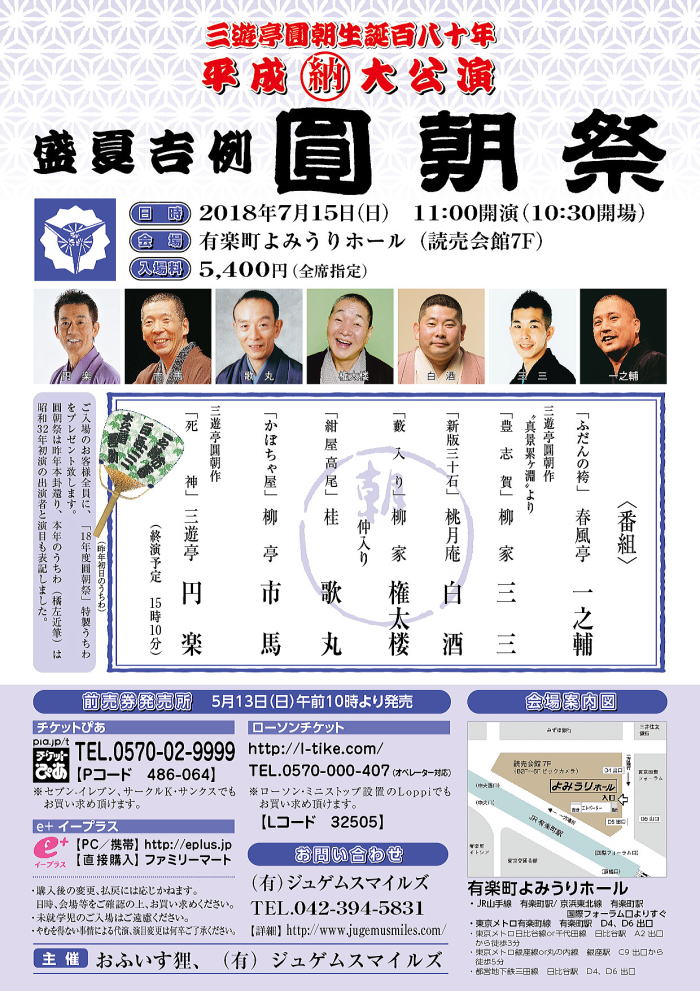 2018年7月15日(日)11:00開演 会 場: 有楽町よみうりホール 〈番 組〉 一、「ふだんの袴」 春風亭 一之輔 仲入り |