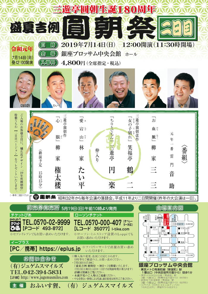 三遊亭圓朝改作 一、「女の子別れ」 笑福亭 鶴 二 一、「ちりとてちん」 三遊亭 円 楽